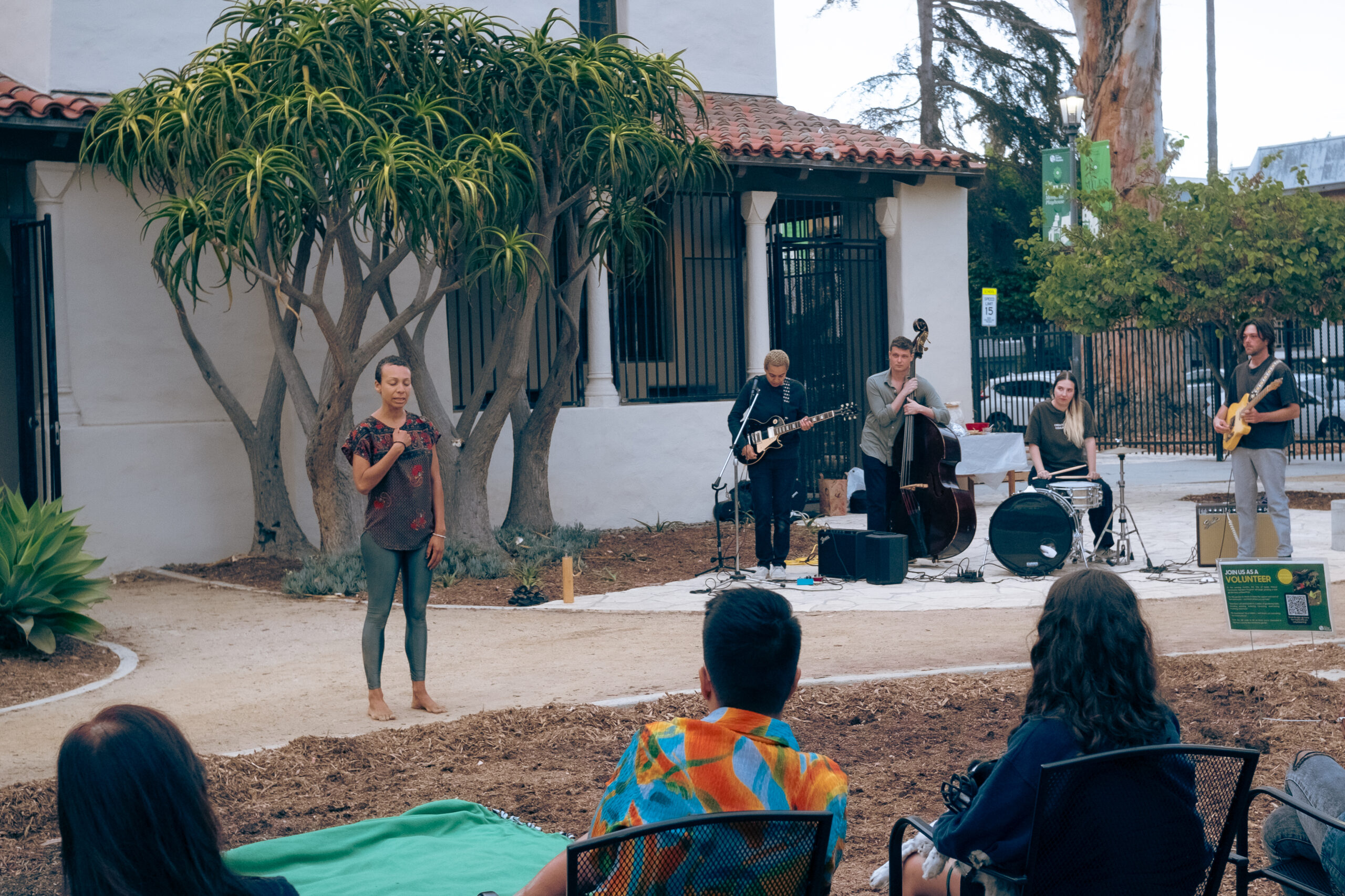 The project that Lindsey brought to the Miles Memorial Playhouse was one whose seeds sprouted in Altadena in the weeks before they relocated. “New movements began to emerge in my body at night, the only time quiet enough for a new idea to come through me. So I brought an idea from the Land called ‘Emergence, Infinite Spirals of Light.’ I also brought the voices of the Trees and created space for them to speak through me. I shouted and stomped my feet and shared the message, that ‘these Trees have something to say, stop cutting down my family!’ It was the least I could do for my Tree family after all the knowledge and wisdom they have shared with me over the years. The Trees are under attack. They have a right to live just like you and me.”